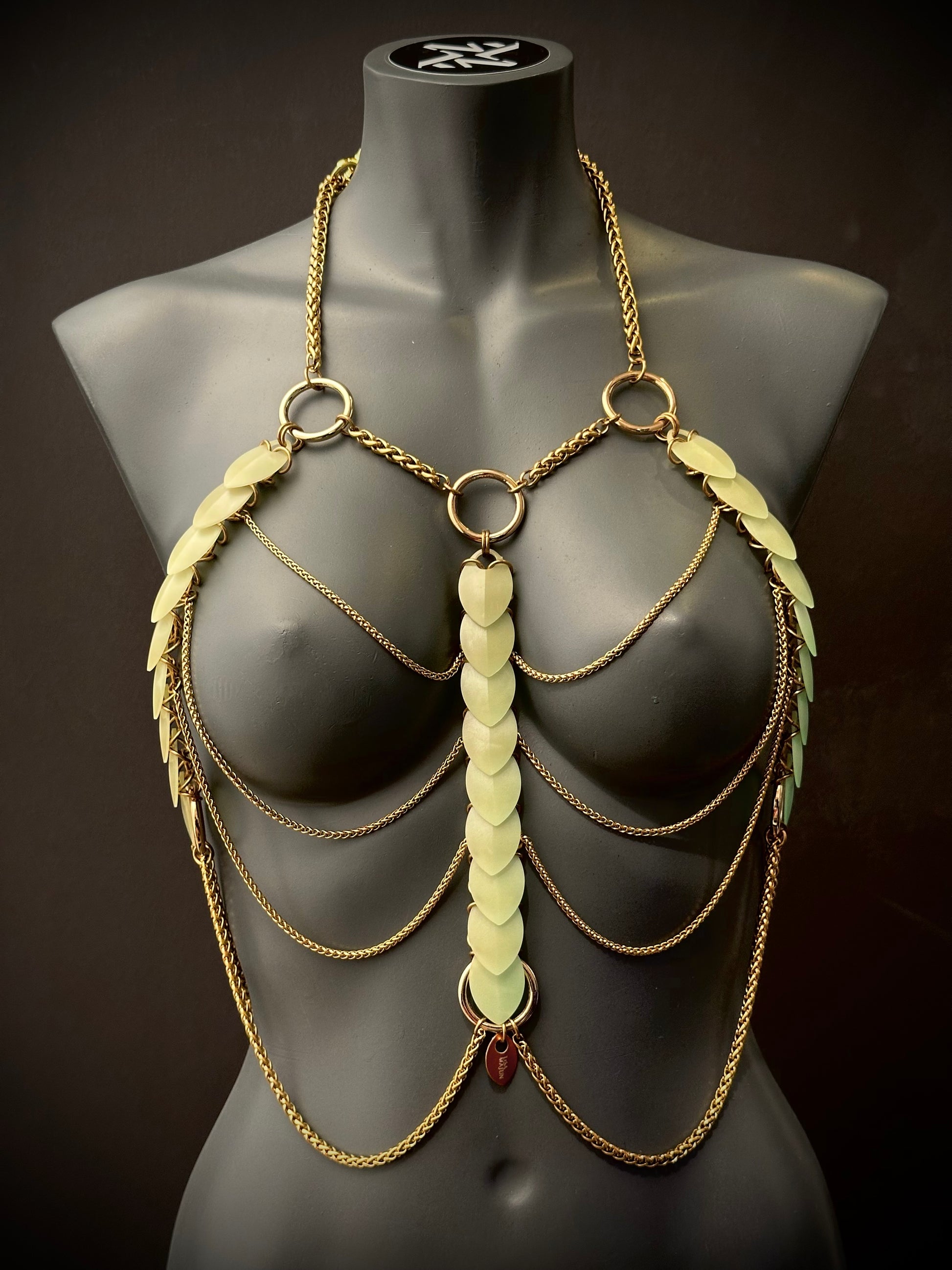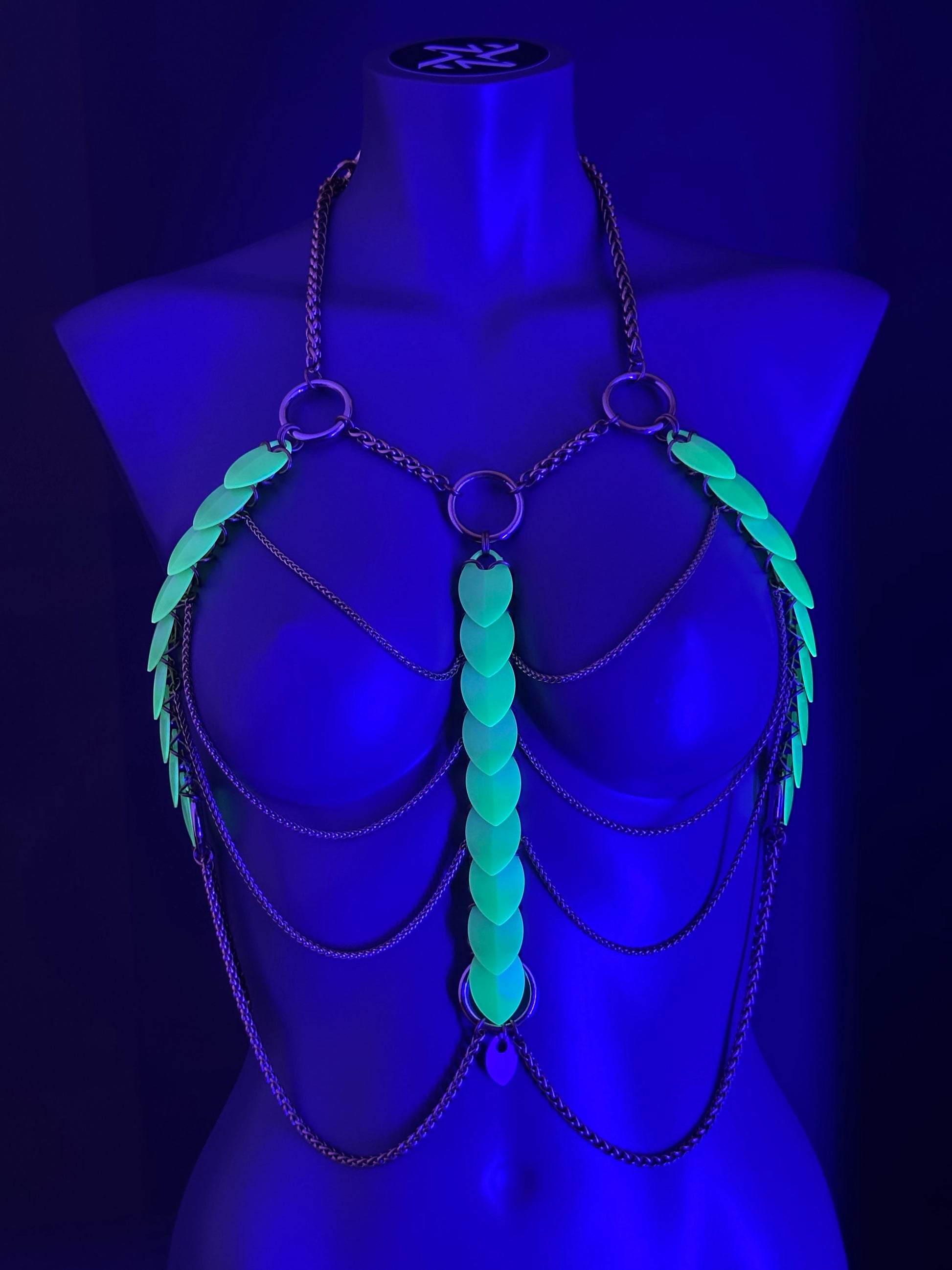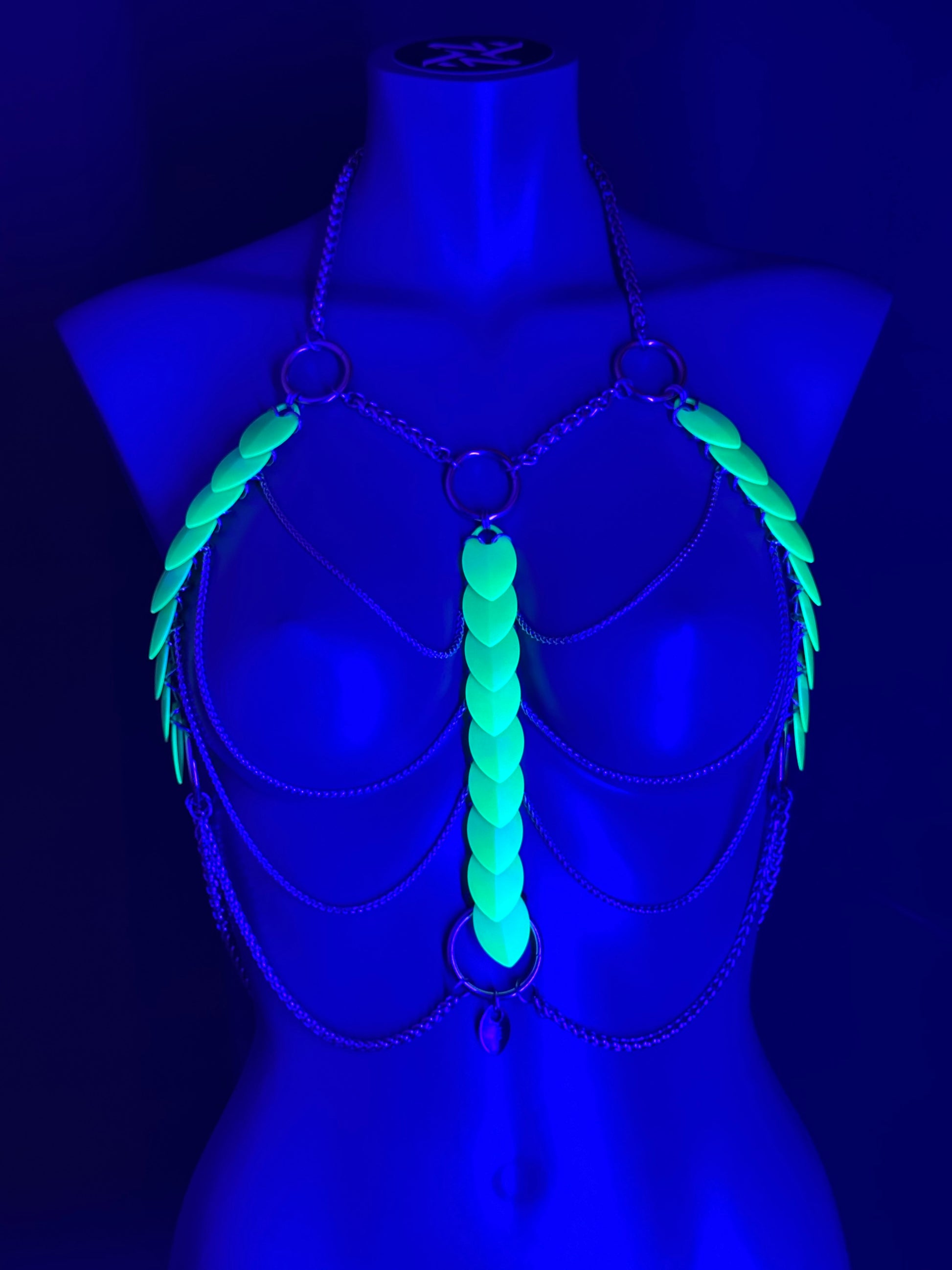 Wir präsentieren das Aphrodite Fire Harness – Glow in the Dark Edition : eine Verschmelzung von Licht, Bewegung und ausdrucksstarker Präsenz. Handgefertigt aus Edelstahlketten und leuchtenden, perlmuttfarbenen PVC-Schuppen, lädt sich dieses Harness im Laufe des Tages durch Sonnenlicht oder UV-Licht auf.