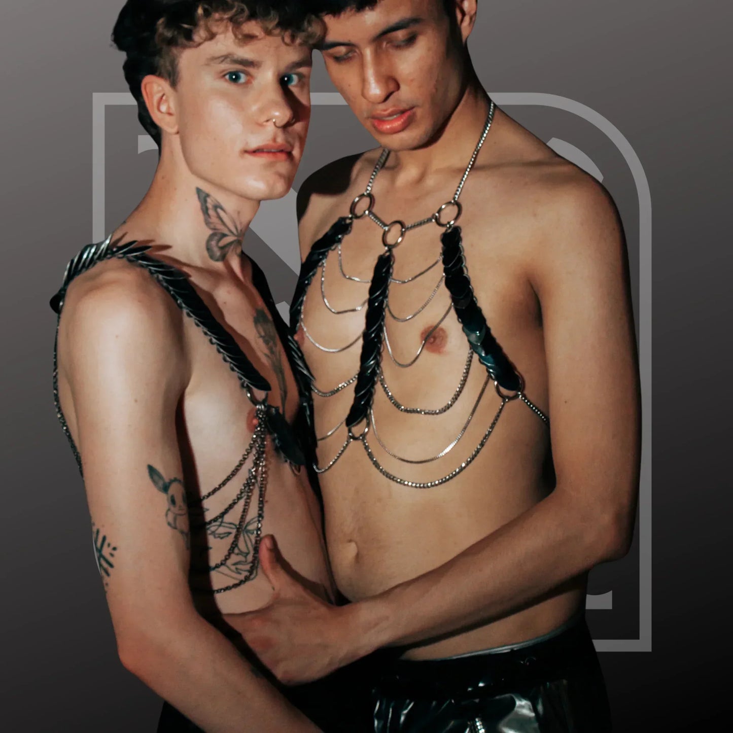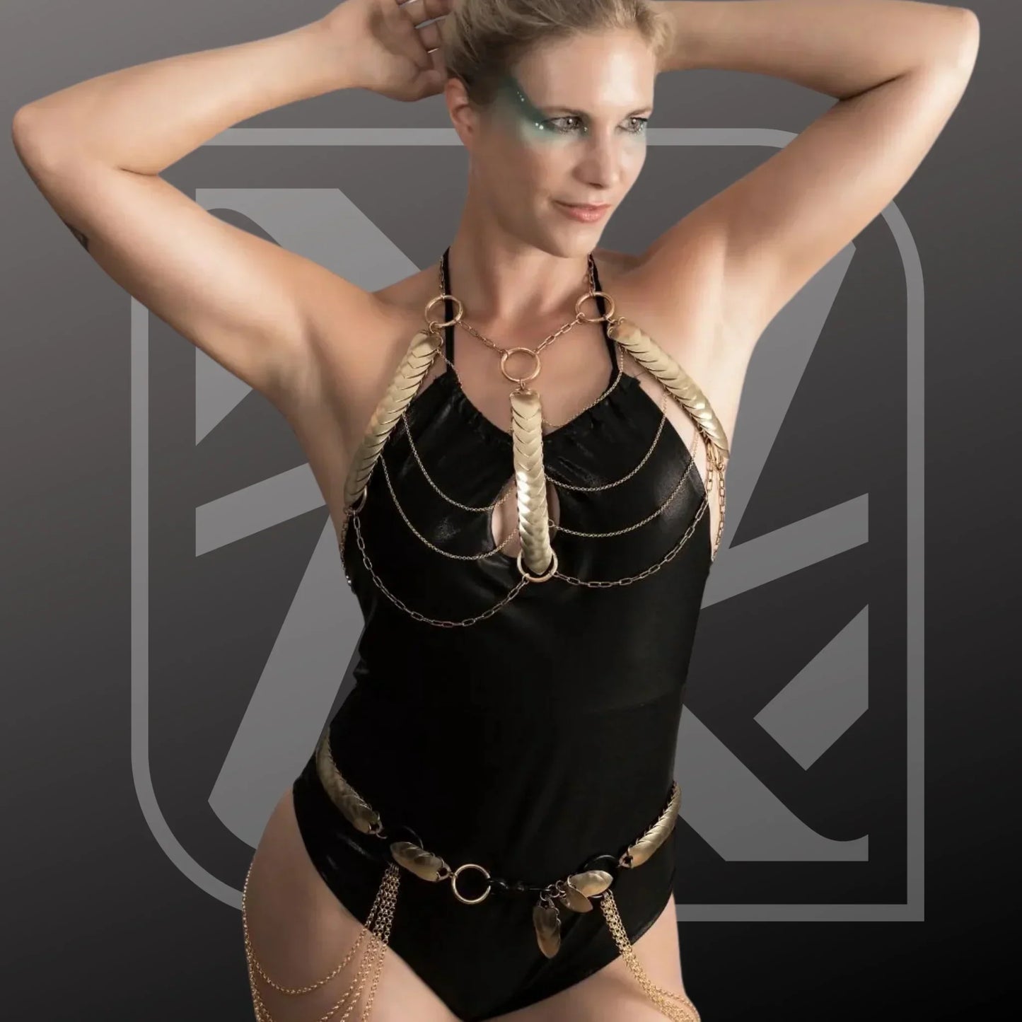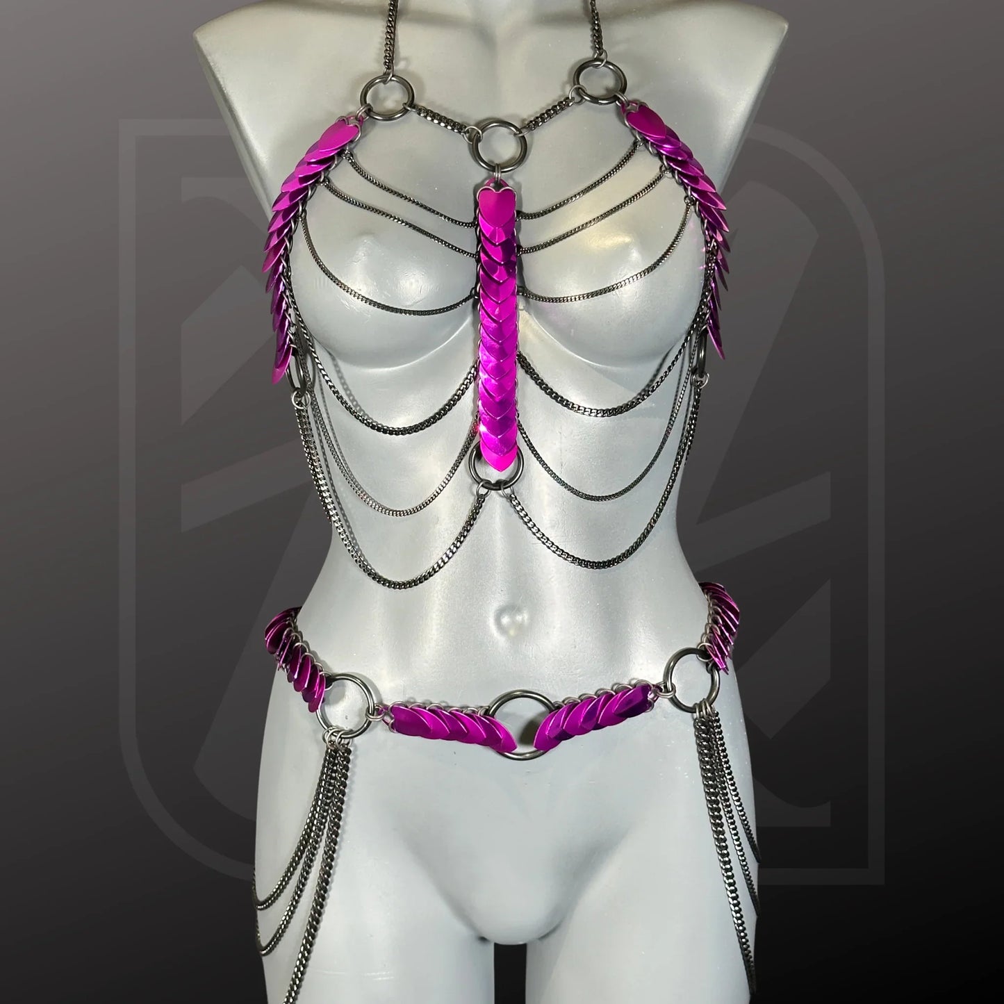 A versatile statement piece that combines sculptural design with wearable art. Handcrafted from anodized L-scales and stainless steel, this luxury body jewelry can be worn as a harness or belt, offering endless styling possibilities for festival fashion, rave wear, and high-fashion looks.